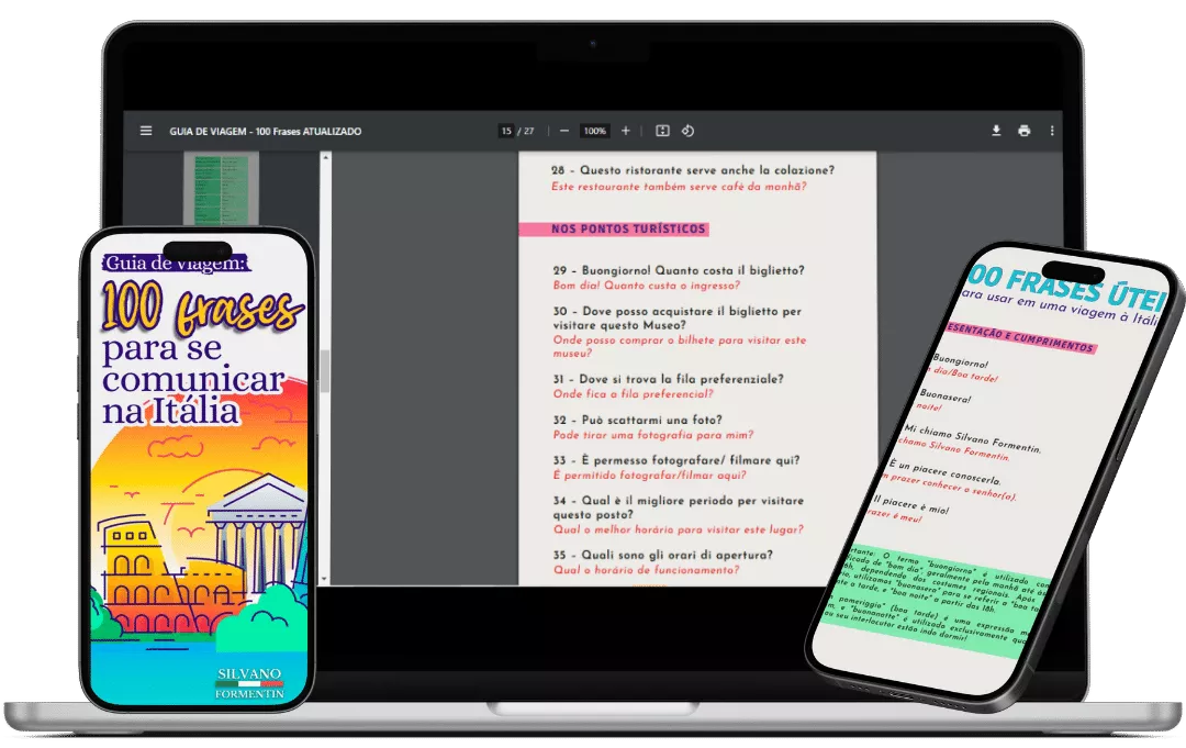 Nele, eu coloquei as principais frases que você irá usar durante a sua viagem, do aeroporto, até os pontos turísticos mais famosos da Itália.